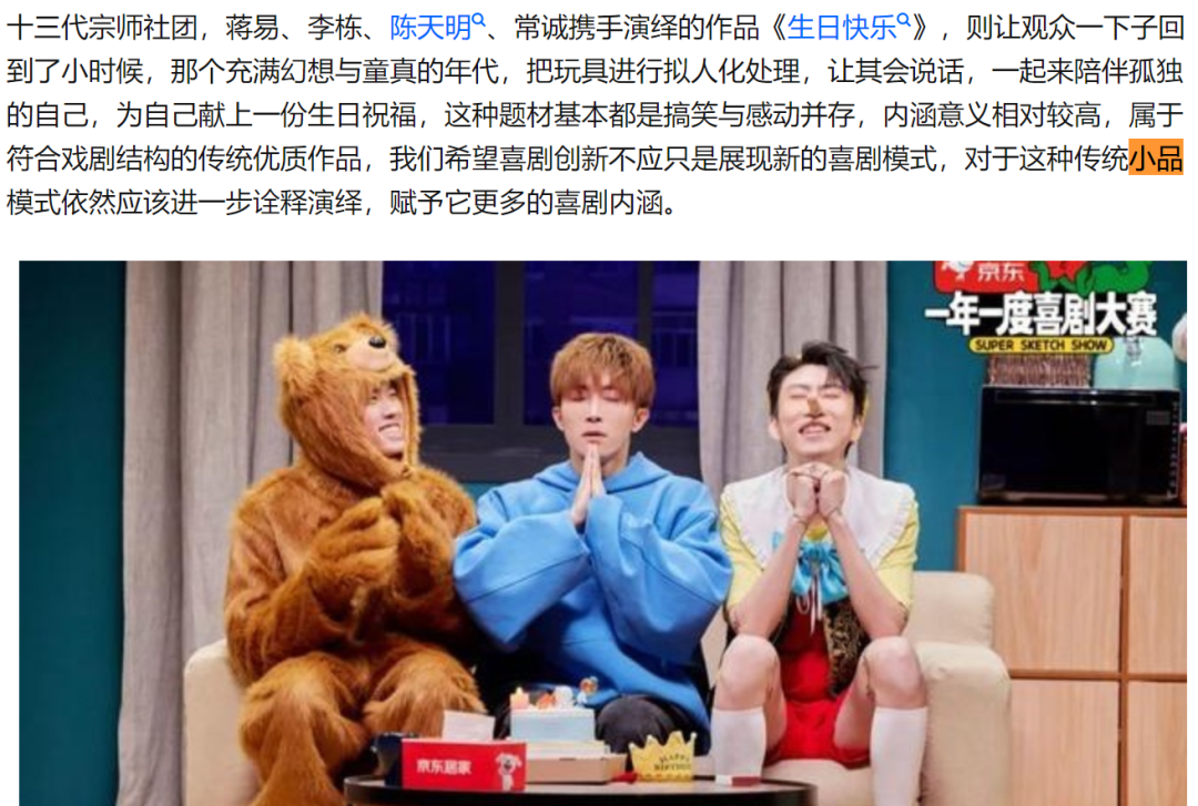 比如不少媒体的推文里,虽然在很多营销号、热搜榜的推文里,小编们还是喜欢用“哈哈哈哈这个小品绝了”作为传播文案,但只要上升到深度分析,总会提到这么一句:“一说到喜剧,我们总是会想到小品、相声……”