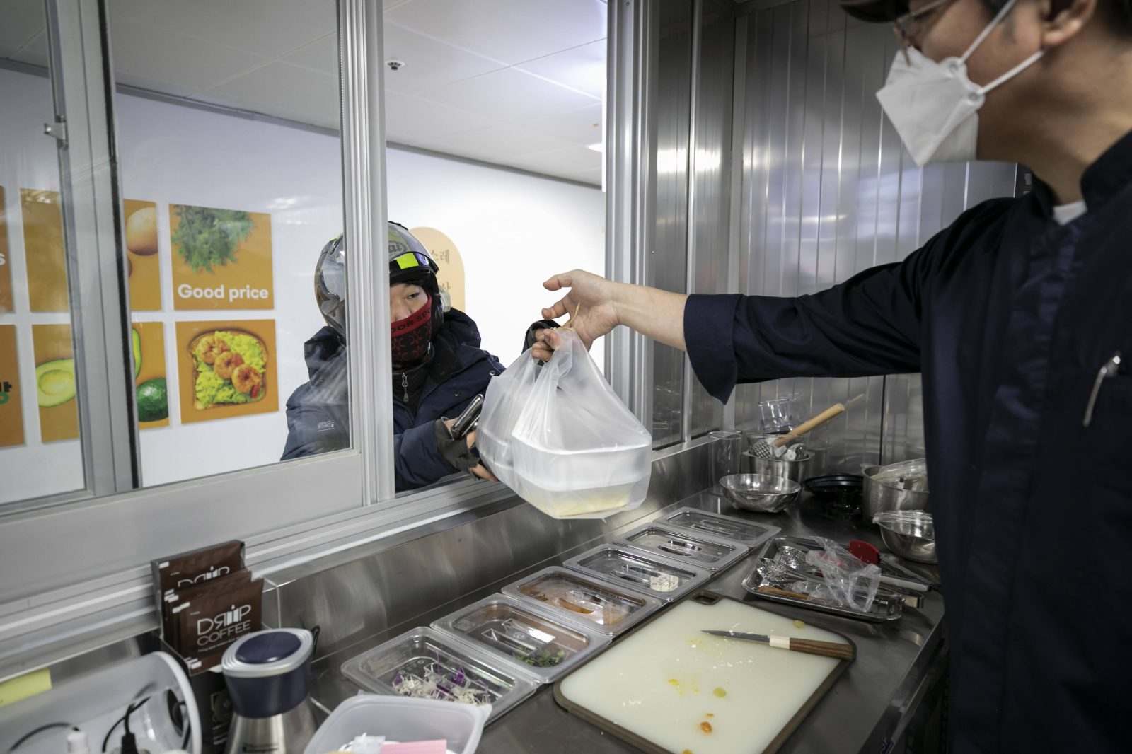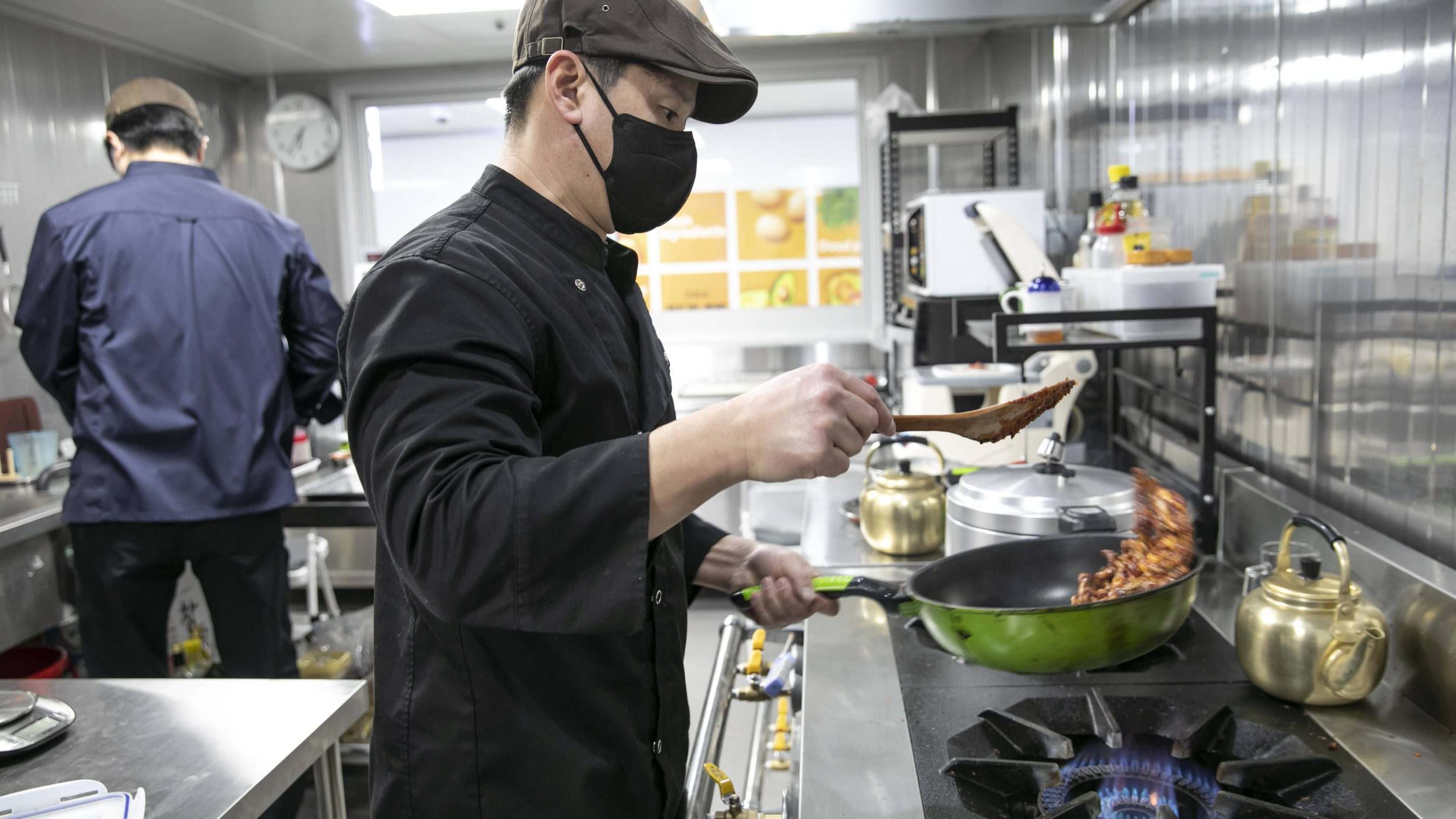 金柱贤的餐厅实际上只是一个小厨房,里面有几张不锈钢制的工作台,只提供外卖服务。他通过一个左右滑动的窗口将热气腾腾的门店招牌菜韩式辣鸡爪递给外卖骑手。通常,进入他餐厅的也只有骑手。