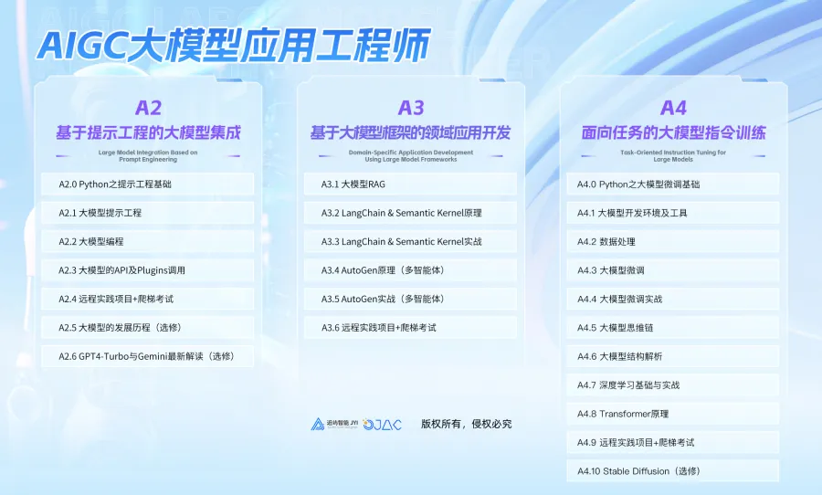 A系列:AIGC大模型应用工程师课程:本课程专为零基础到进阶的 AI 工程师学员打造,会依据个人情况定制学习路径。A2 阶段起,学员可在 100 个横跨多行业的真实选题中,开展 AI 智能体项目,全面提升技术与实战力,精准培育 AI 高薪人才。